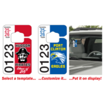 Our most popular Hangtag size! Roomy enough to fit all your custom information PLUS a large, easy-to-read number! Imprinted with bright, UV resistant ink colors that won’t fade in daily sunlight! Easy to mount on your mirror stem…store it in glove compartment when not in use! Use our easy-to-customize templates to create the parking permit you want, or let our talented artists make your design idea a reality!